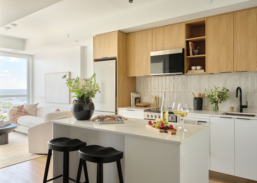 Inside, the suites span from thoughtfully planned one-bedroom layouts (with or without a den) to generous two-bedroom-plus-den residences. Open-concept designs ensure a seamless flow between living, cooking and entertaining zones, while lofty ceilings and floor-to-ceiling windows flood each home with natural light. Underfoot, luxury vinyl plank flooring leads to sleek kitchens outfitted with quartz countertops and top-of-the-line appliances; every suite even includes in-unit laundry for maximum convenience.